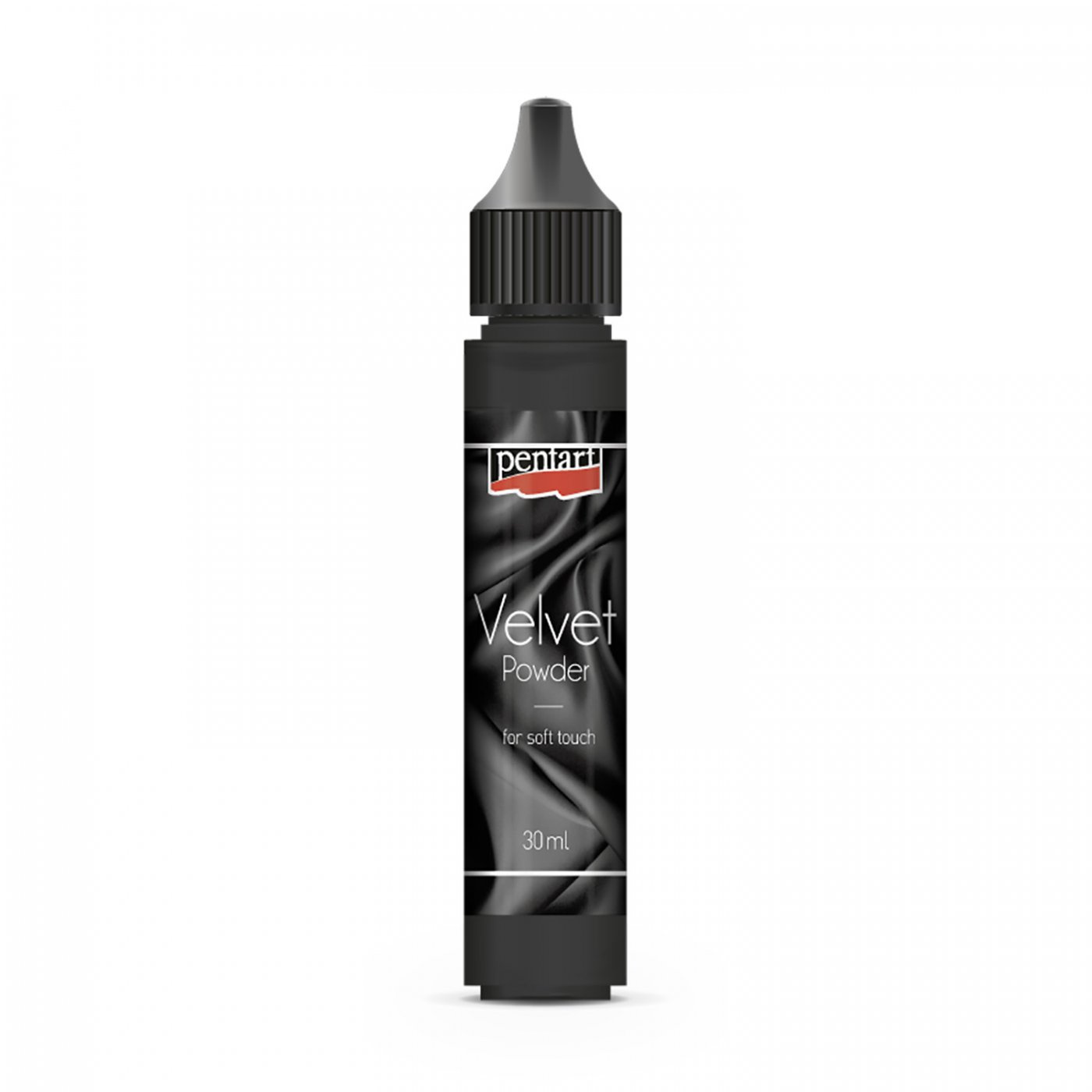 Velvet powder je sametový prášek, který vytváří sametový povrch. Dá se jednoduše „fouknout“ přes hrot na ještě mokrou barvu nebo lepící povrch. Doporučujeme používat s Hobby lepidlem, Fabric médiem, Heavy body gelem, ale perfektně funguje i při použití oboustranné lepicí pásky.