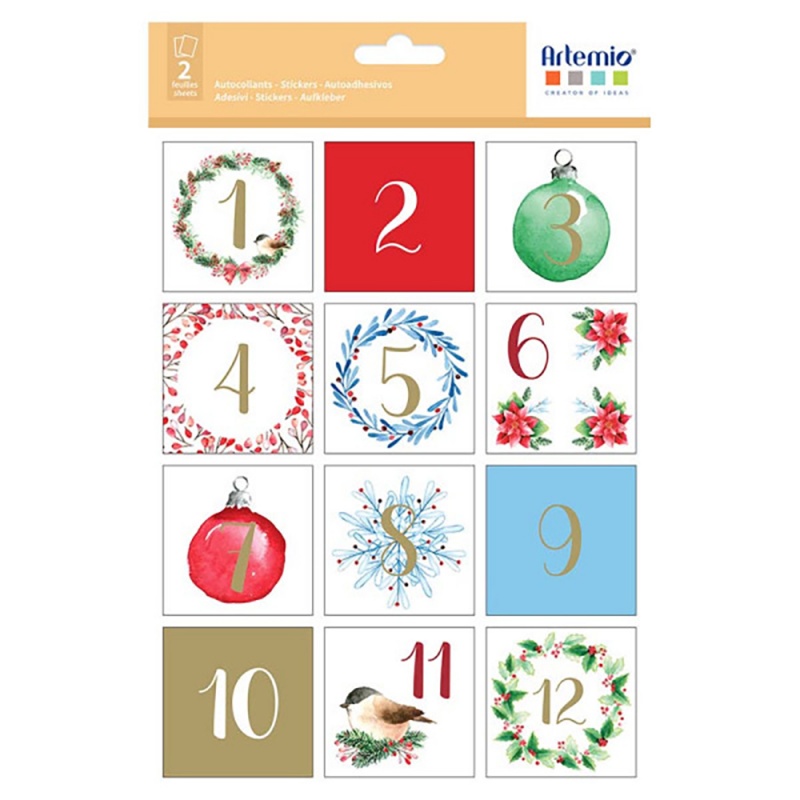 Adventní čísla ve tvaru čtverců jsou samolepky s čísly od 1 do 24 a malé vánoční motivy s rostlinami. Samolepky jsou nalepené na papírovém archu, který se snadno odlepuje. Samolepky jsou papírové, zcela hladké a měří 5 x 5 cm.