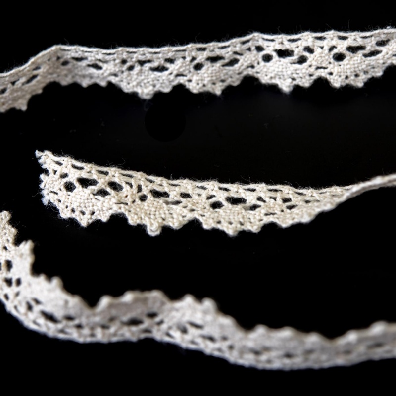 Dekorační bavlněná krajka o šířce 13 mm s rovným horním okrajem. Horní okraj je navíc elastický, takže krajku lze natáhnout. V uvolněném stavu tvoří spodní část jemné vlnky.