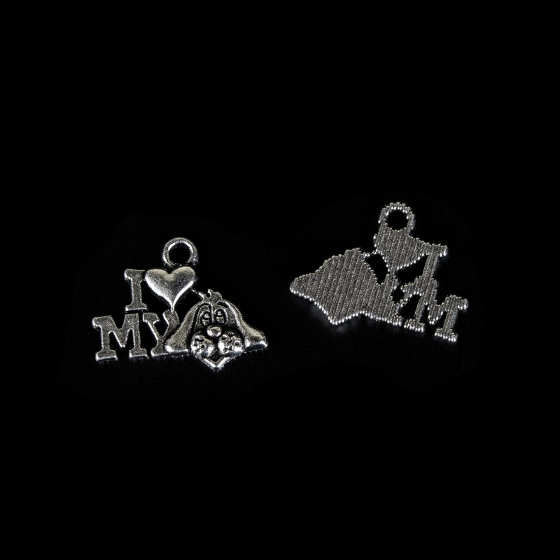 Kovový korálek ve tvaru nápisu I love my dog (miluji svého psa). Korálek má ve vrchní části očko pro navlékání o průměru 2 mm.