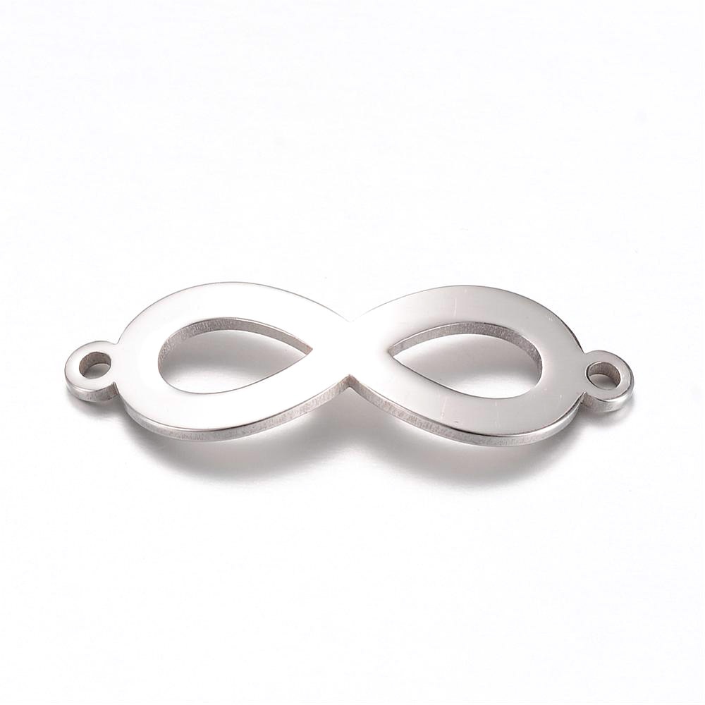 Kovový korálek ve tvaru ležaté osmičky - nekonečno. Korálek má na obou stranách dvě dírky pro navlékání. Dírka má průměr 1,5 mm. Korálek se používá k tvorbě náramků jako středový zajímavý prvek, po stranách se upevňuje šňůrkou. Korálek má mírně prohnutý tvar, aby se přizpůsobil tvaru ruky.
