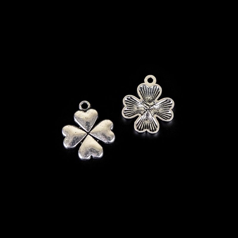 Kovový korálek ve tvaru čtyřlístku. Korálek má ve vrchní části očko pro navlékání o průměru 2 mm.