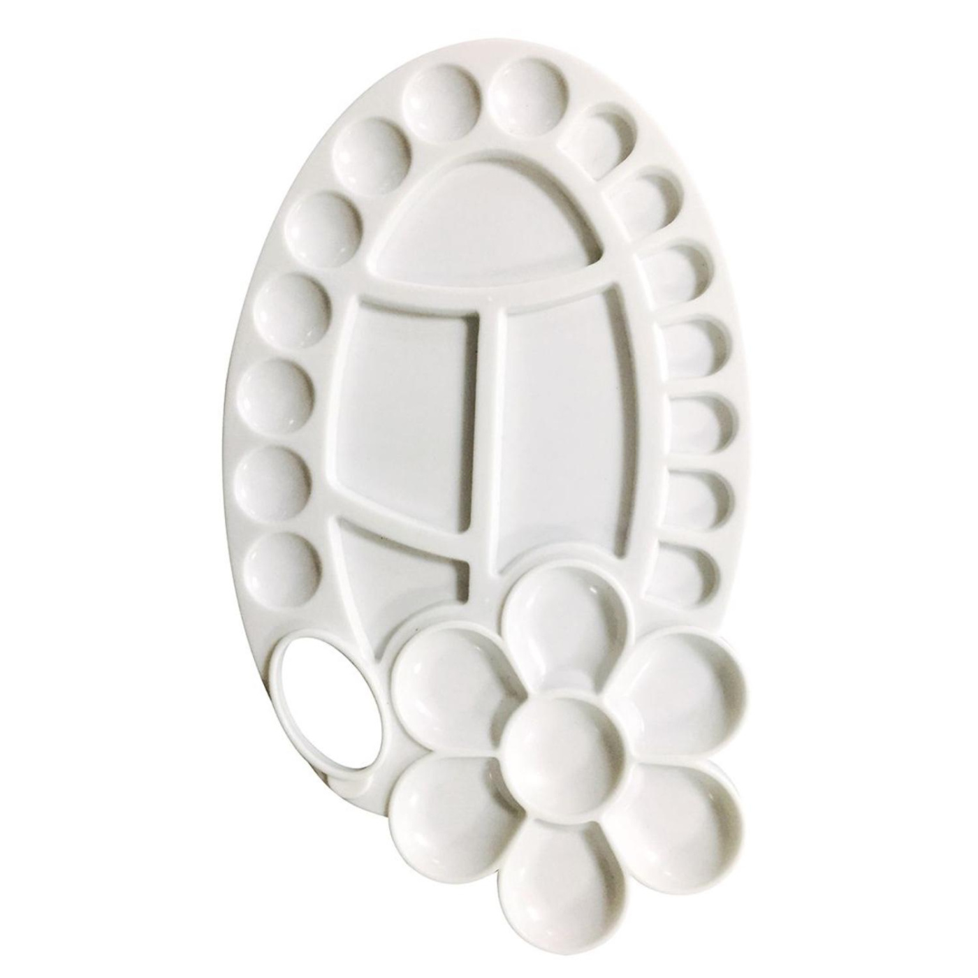 Plastová paleta ve tvaru květiny s 26 různými pohárky. Kalíšky mají různé velikosti pro různé použití. Uprostřed palety je větší prostor pro vypracování barev a míchání odstínů. Paleta má také otvor pro palec.