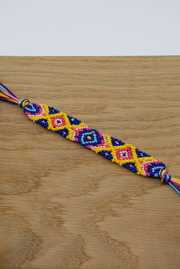 Koniec náramku priateľstva je zviazaný do druhého uzla, čím sa vytvorí časť na viazanie.